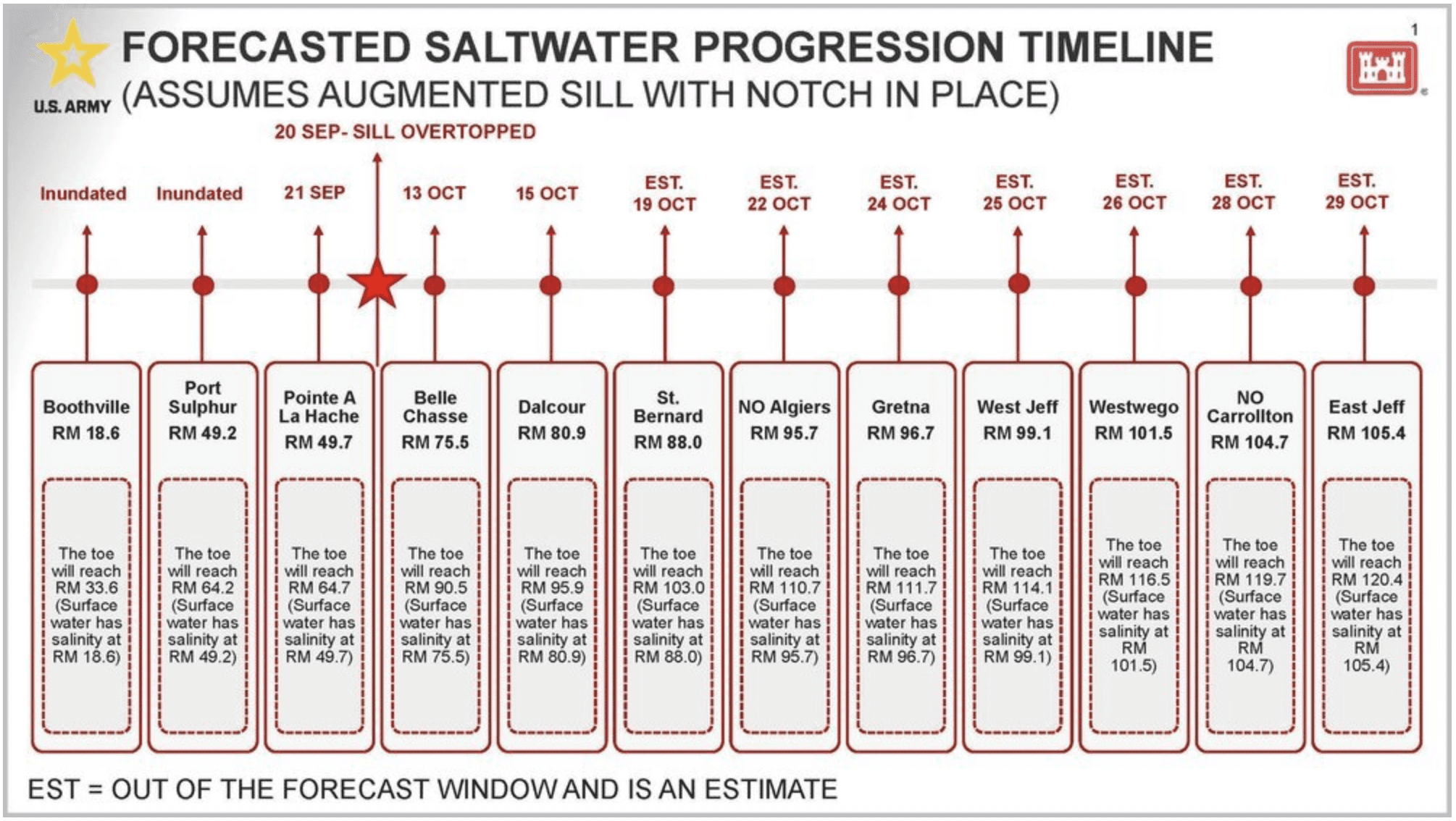 First forecast published by the USACE - Oct. 2023: By this time, two water intake systems in Plaquemines Parish had already been inundated.