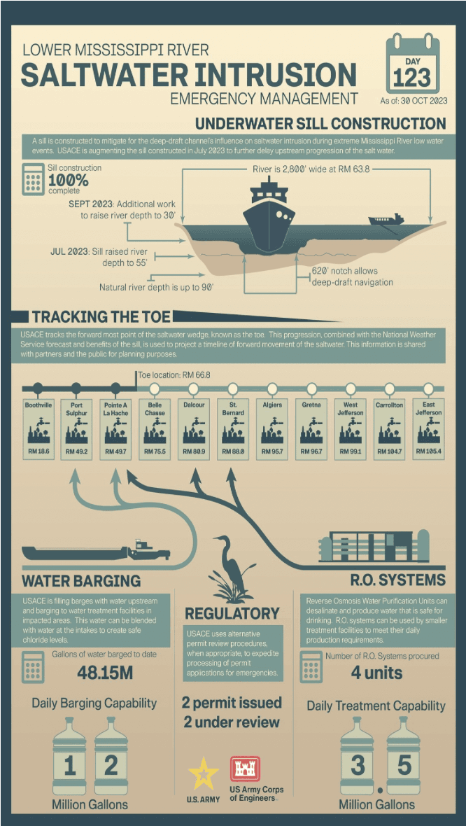 In October 2023, a saltwater intrusion from the Gulf of Mexico was expected to reach the City of New Orleans. This intrusion, where saltwater moves up the river, was caused by a lack of rainfall in the Midwest region of the United States contributing to lower river flows. The result was a large saltwater wedge in the Mississippi River, formed by dense saltwater moving upstream as the insufficient freshwater flows lacked the volume to push back. The lower parishes of Louisiana rely on the Mississippi River for their drinking water supply. This dependence makes them particularly susceptible to saltwater intrusion, a threat exacerbated by climate change and aging infrastructure. The river is managed by the United States Army Corps of Engineers (USACE), and regional collaboration was essential in supporting communities during the crisis.