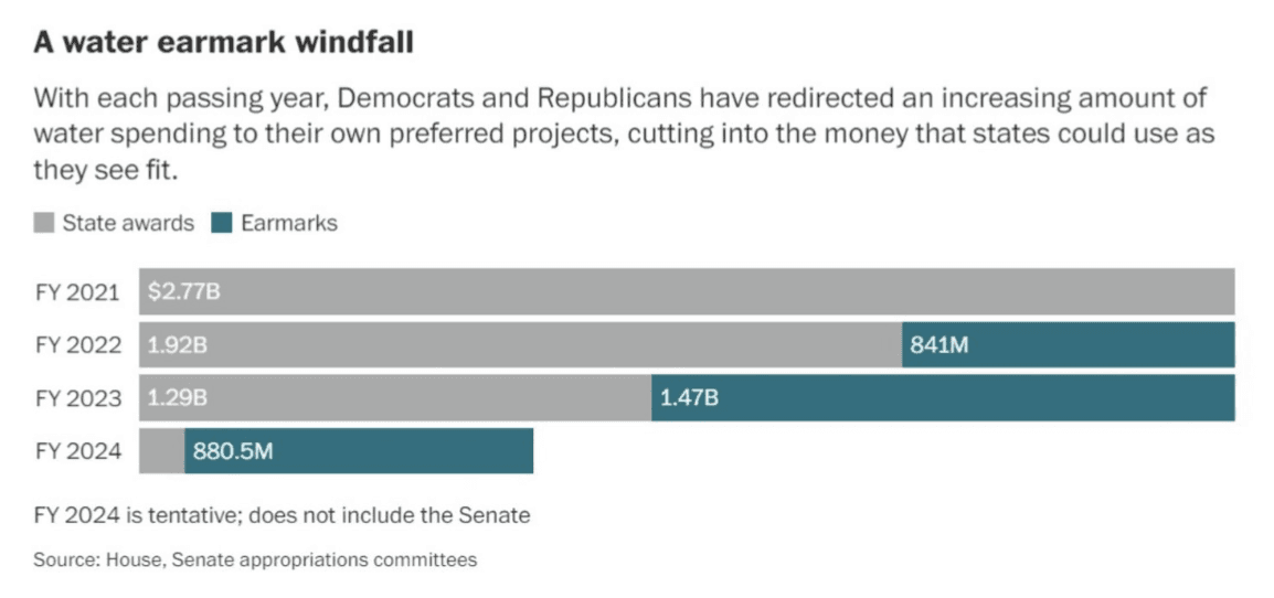 Source: Tony Romm. "States lose federal water funds as lawmakers redirect money to pet projects." The Washington Post.