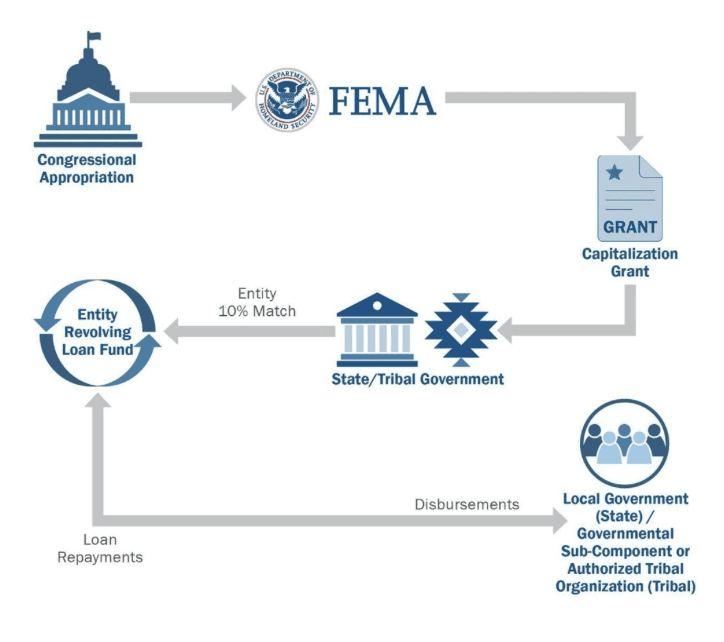 The Revolving Loan Fund operates as a financing mechanism for FEMA and other governmental bodies to offer loans to eligible recipients for specific projects. Upon project completion, loans along with interest are returned to the fund, creating a cycle of financing. FEMA allocates funds to states and tribal governments through a capitalization grant, with entities contributing a minimum of 10% to the established loan fund. As loans are repaid, the funds become available for new projects. These low-interest loans, capped at a rate of no more than 1%, will enable local governments to implement essential projects without facing financial burdens.