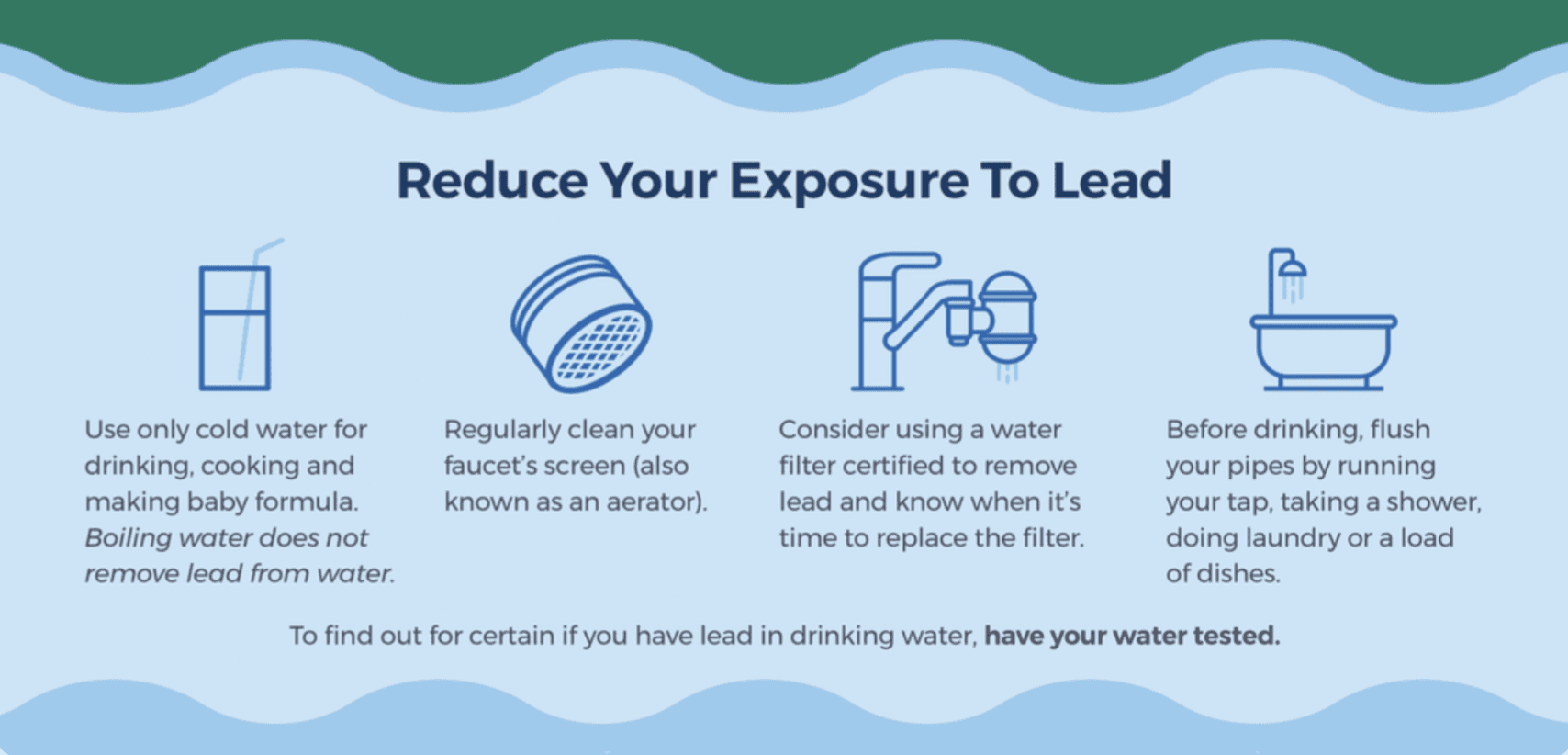 Test your water. It is also good to test your water regularly if you suspect there is lead contamination. Knowing if there is lead in your drinking water will allow you to proceed with caution and implement any mitigation strategies.