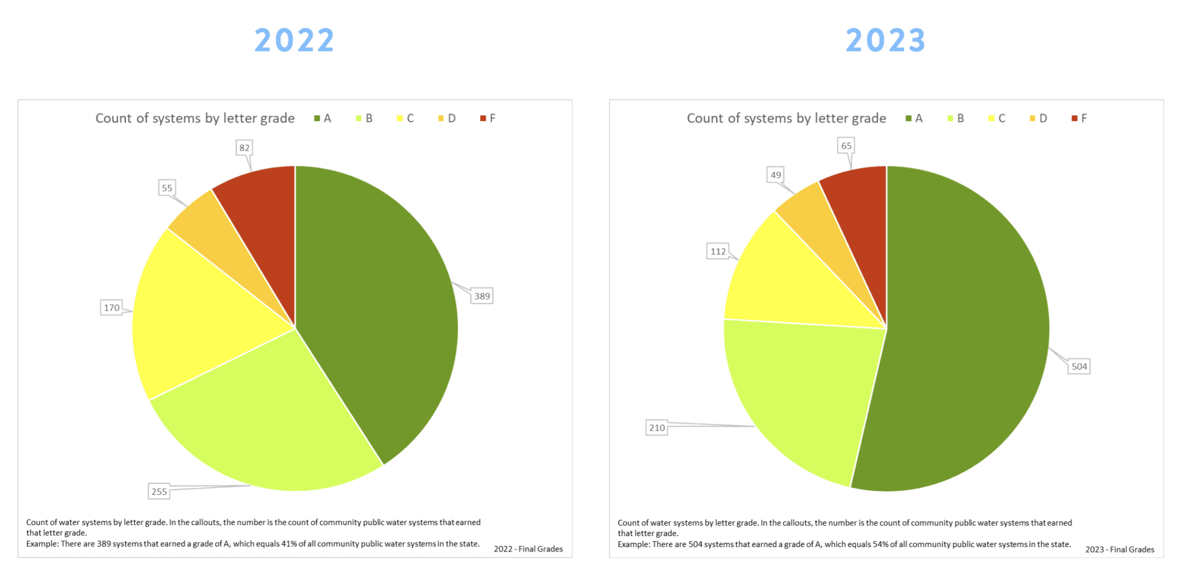 In 2023, 504 community water systems (CWSs), representing 54% of all Louisiana water systems, scored an “A,” marking an increase of 115 systems to achieve this grade in a year. The Algiers system is one of 210 water systems to receive a “B” grade in 2023, indicating good but not excellent performance. The Carrollton system is one of 49 water systems to receive a “D” grade in 2023 and one of 28 systems downgraded from 2022 to 2023, highlighting areas for continued improvement. While the number of systems to backslide is substantial, it is also noteworthy that the number of CWSs to receive an “A” grade increased across the state as a whole. Natural decline due to factors such as aging infrastructure, inadequate maintenance, or operational challenges of already struggling systems could also contribute to decreases in score.